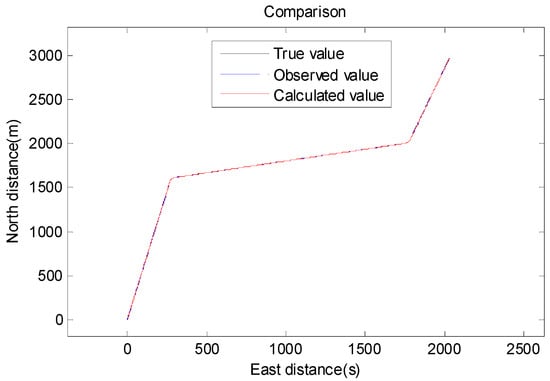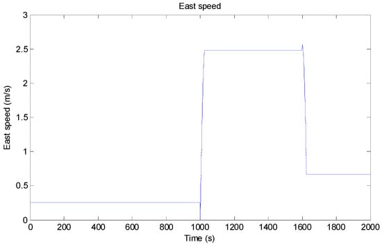 In order to verify the accuracy and stability of the filtering process, we established a motion model in which the state of motion changed with time. We assumed that the AUV’s travel time was 2000 s. First, the AUV traveled in a straight line with a north velocity of 2.57 m/s and an east velocity of 0.27 m/s for 1000 s. Then, a heading rate of change of AUV to the east was used for steering, and the course change time was 25 s. Then, the speed was maintained after steering from 1025 s to 1600 s. A heading rate of change of 3°/s to the north was used for turning at the time of 1600 s, and the course change time was 25 s. Finally, the AUV continued in a straightforward direction after turning. From 1000 s to 2000 s, the drive speed was 5 (2.57 m/s). The process of motion is shown in Figure 3 and Figure 4.