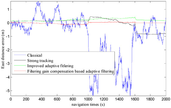 Based on the above simulation analysis, we can conclude that the filtering effect of the gain compensation-based adaptive filter is obviously better than that of the classical Kalman algorithm and the strong tracking filtering algorithm in the integrated navigation process. In the case of a complex state of motion, the filtering effect is better than that of the improved adaptive filtering algorithm.