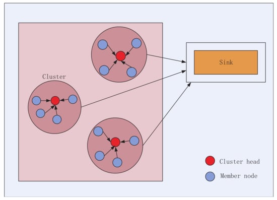 The structure of the network is illustrated in Figure 1. Each cluster has its own CH and cluster members. Each cluster member collects the data and forwards it to the CH. Then, all CHs with the function of aggregating and compressing the information will process the data and then transmit the information to the sink node.