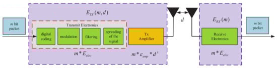 The radio hardware energy consumption model is shown in Figure 2. The radio electronics and the power amplifier are run by the transmitter, and the radio electronics are also run by the receiver. Both operations consume energy. The energy consumption model adopts the free space channel with energy consumption and the multipath channel with energy consumption depending on the distance between the transmitter and the receiver [,,,,]. Thus, to transmit a packet of m bits at a distance d, the energy consumption is given by the following equation: