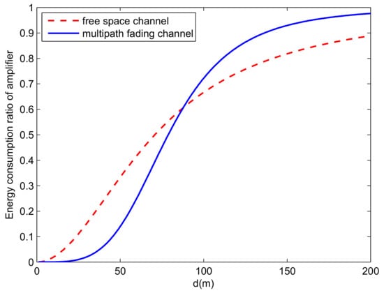 where p is the ratio of the total number of CHs to SNs and represents the probability of each node becoming CH during round 0 [], r is the current number of rounds, G is the set of the nodes that will not be elected as a CH in a recent round, and denotes the modulus operator. The power amplifier energy consumption to total energy consumption ratio versus the distance is shown in Figure 3. The power amplifier energy consumption to total energy consumption ratio can be calculated by: