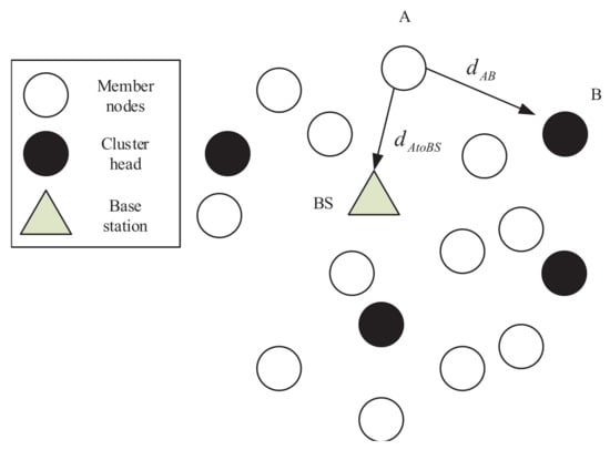 As shown in Figure 4, when the cluster head in the network is elected and the cluster head broadcasts messages to other nodes, the non-cluster head node A finds the nearest cluster head B according to the received signal strength, and calculates the distance between them, i.e., . When ( denotes the distance between the node A and BS), node A does not join any cluster and communicates directly with the base station during the data communication. When , node A joins the cluster where cluster head B is located and acts as a member node in the cluster.