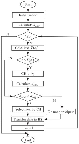 According to [], we know that SNs consume more energy during communication than during the computation process. In contrast, some other protocols adopt multi-hop communication, and the nodes close to the BS have excessive transmission overhead, leading to energy holes in the sensor field []. To address the energy hole problem and prolong the network lifetime, many clustering protocols have been specifically proposed for WSNs. The low-energy adaptive clustering hierarchy (LEACH) is the most important hierarchical routing protocol in terms of saving energy compared with traditional routing protocols []. In this type of protocol, the entire network is divided into several clusters, and each cluster selects a node in a probabilistic manner as a CH that is in charge of receiving, aggregating, compressing, and sending the information collected from other non-CH nodes to the BS. With the objective of minimizing the energy consumption of the WSNs, the LEACH routing protocol designates a single CH node in each cluster and selects the CH on a rotation basis. Although the efficiency of the LEACH protocol has been closely studied, it still has some drawbacks that require improvement—on one hand because selecting the CH is based on a random round robin, the number of CHs is unreasonable in each round, and the nodes at the boundary of the network will be elected as the CH. On the other hand, there is no consideration of the distribution of the CHs, the threshold condition, and the remaining energy of each node after the end of each round. Consequently, these issues will result in energy overheads.