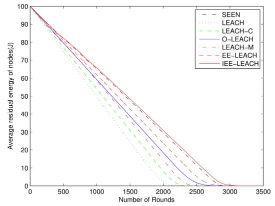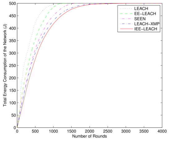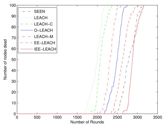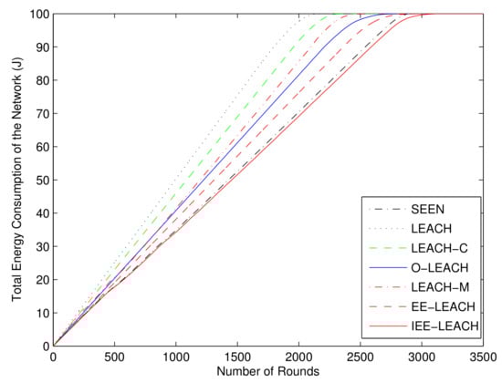 To prove that the performance of the proposed protocol is better than that of the existing protocols, the total energy consumption of the proposed protocol is compared with that of LEACH, LEACH-M, O-LEACH, LEACH-C [], EE-LEACH [] and SEEN, under the same simulation conditions. Figure 11 shows the total network energy consumption of the protocols versus the number of rounds. As shown in Figure 11, the LEACH-C protocol optimizes the cluster head selection and consumes less network energy than the LEACH protocol in the same round. The LEACH-C prolongs the network lifetime to 2723 rounds as compared to 2267 rounds of the LEACH protocol. In addition, the LEACH-M and O-LEACH prolong the network lifetime to 2775 and 2972 rounds, respectively. Because the residual energy of nodes is taken into account when selecting cluster heads and the multi-hop communication mode is applied in EE-LEACH, the EE-LEACH further prolongs the network lifetime to 3114 rounds. The proposed IEE-LEACH protocol not only considers the residual energy and initial energy of nodes when selecting cluster heads, but also considers the average energy of all nodes and the total energy of network to further optimize cluster head selection. Thus, the total network energy consumption of the IEE-LEACH protocol is less than that of the other protocols in the same round, and the proposed IEE-LEACH protocol prolongs the network lifetime to 3242 rounds. Moreover, because single hop, multi-hop and hybrid communication modes are adopted, and the nodes closer to BS than to the CH do not participate in cluster formation, the proposed IEE-LEACH protocol further extends the lifetime of the network.