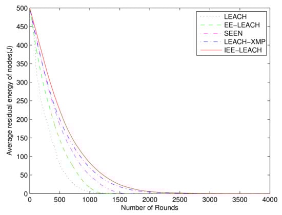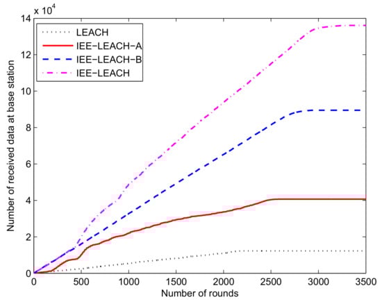 Figure 10 shows the number of cluster heads versus the number of rounds. The maximum number of cluster heads for IEE-LEACH occurs after approximately 700 rounds, and the number of cluster heads is zero after 2600 rounds. However, the maximum number of cluster heads for IEE-LEACH-B occurs in approximately 500 rounds, and the number of cluster heads is zero after 2300 rounds. We find that the number of cluster heads extends up to 2600 rounds for IEE-LEACH as compared to 2300 rounds in IEE-LEACH-B, which is due to the improvement by which the nodes closer to BS do not participate in the cluster formation. The number of cluster heads for IEE-LEACH-A and LEACH disappears after 2050 rounds and 1800 rounds, respectively. It is obvious that IEE-LEACH and IEE-LEACH-B prolong the network lifetime compared with IEE-LEACH-A and LEACH because IEE-LEACH-B and IEE-LEACH consider the energy adjustment parameter when selecting the CH. In addition, the proposed IEE-LEACH protocol generates more CHs than IEE-LEACH-B throughout the 3500 simulation rounds, which can reduce the energy consumption of the WSN nodes. Thus, the proposed scheme is efficient in terms of saving energy and extending the lifetime of the WSN.