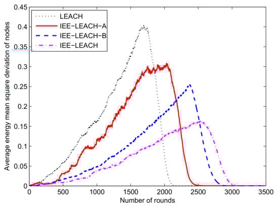 After 10 rounds, we calculate the average energy mean square deviation of the remaining nodes to analyze the energy distribution in the whole network. We can obtain the optimum number of CHs depending on the analysis of the average energy mean square deviation of nodes to transmit information and increase the performance of the entire network. Figure 9 shows that the slope of the LEACH is larger than the proposed protocol before the degree of energy dispersion increases to the maximum. However, the volatility of the proposed IEE-LEACH is less than 0.1. This finding implies that the performance of the proposed IEE-LEACH protocol is better than other protocols in terms of the energy consumption. This improvement is because the proposed IEE-LEACH protocol extends the lifetime of the network by balancing the node energy.
