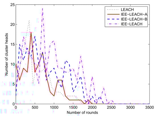 To demonstrate that it is necessary to consider the improvement when nodes closer to the BS do not participate in clustering formation, the simulation results of the cluster heads number for the IEE-LEACH-B and IEE-LEACH protocols are provided in this section. Unlike the LEACH and IEE-LEACH-A protocols, IEE-LEACH-B and IEE-LEACH consider the energy when selecting the CH. Thus, IEE-LEACH-B and IEE-LEACH can select the optimal number of cluster heads.