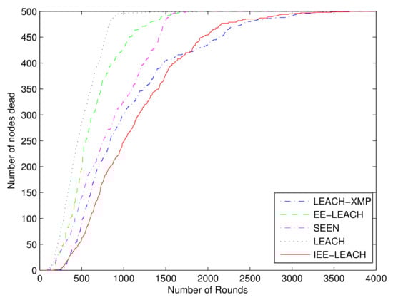 To further demonstrate that the performance of the proposed IEE-LEACH protocol is still prominent in large scale, we construct a WSN with randomly deployed 500 sensor nodes in a sensor field. It is clearly from Figure 12 that, compared with the existing routing protocols, the network lifetime is enhanced by the proposed IEE-LEACH protocol as the number of rounds increases. Figure 13 and Figure 14 display the chart view of residual energy and total energy consumption in the network. All nodes in the existing LEACH, EE-LEACH, SEEN and LEACH-XMP protocols are dead after 1328, 1534, 1731 and 2724 rounds, respectively. However, all nodes in the proposed IEE-LEACH are dead after 2692 rounds. It can be seen that the new proposed scheme which considers the initial energy of nodes, residual energy of nodes, total energy of the network, and average energy of all nodes increases the network lifetime by about 5% to 75% compared with different routing protocols. Therefore, it is apparently observed that the proposed IEE-LEACH algorithm performs equally well in case of large network size and is scalable enough for large network areas.