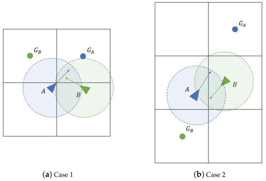 Although the coincident cell behavior (see Figure 2, labeled with 2) may avoid some collisions between the quadcopters, in some other situations an additional mechanism must be implemented to avoid an impact. In Figure 3, two examples of these type of situations have been represented.