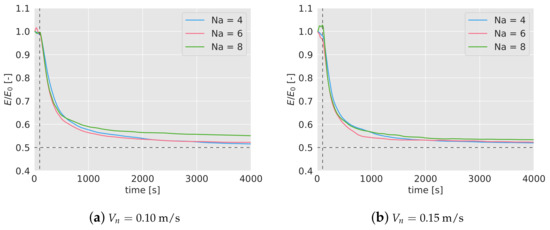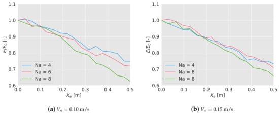 The second experiment carried out to validate the result of the simulations has been the tracking of the efficiency if half of the agents stop working at certain point of the mission ( 100 s), in the same way as it was done in Section 5.3. In Figure 13a,b, the efficiency tracked over time for 4, 6 and 8 agents and 0.10 m/s, and for 4 agents and 0.15 m/s, has been shown. As done before, the efficiency has been normalized with the efficiency without any failure, . After 100 seconds, half of the drones are forced to land (marked with a dashed line in the graphs), and as a consequence, the efficiency starts decreasing gradually. In the first 100 s, before the failure, the normalized efficiency remains close to 1, as expected. The efficiency drop is very similar for 4 and 6 drones, and it is independent of the nominal speed.