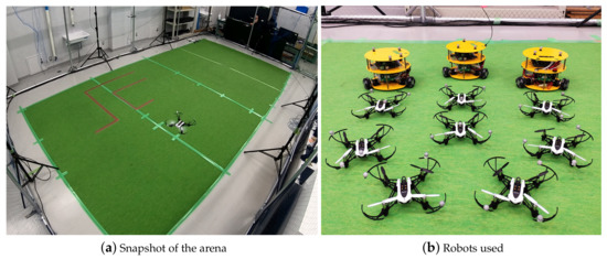 Test arena and robots used. In (a), a snapshot of the arena during a surveillance test. In (b), the quadcopters used (Parrot Mambo Minidrones). In the same figure appear the ground robots that were used for the case study mission, as it will be presented in Section 7.