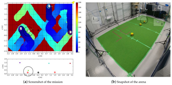 Screenshot of the surveillance mission at a certain instant. In Figure 14a, in the upper graph, the position of each quadcopter and ground robots in the plane has been represented. In the background, the age of the cells. Each of the 4 agents has been labeled with its ID. The position on the camera has been indicated with a yellow trapezoid. In the lower graph, the position in the plane. Friendly intruders have been plotted in black; enemy intruders in red. Note that agent number 2 is observing (flying at a low altitude) one of the enemy intruders. In Figure 14b, a snapshot of the arena.