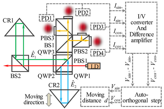 The principle and data processing procedure of the displacement measurement based on the homodyne interferometer fringe pattern analysis are shown in Figure 2. A linearly polarized beam emitted from a laser diode is split into a reference beam and a measurement beam by PBS1. The reference beam is reflected by CR1 and passes through QPW2 twice before going back to PBS1. The reflected measurement beam, which is reflected by CR2, passes through QPW1 twice before going back to PBS1, combining with the reflected reference beam. The combined beams () interfere with each other. The interference signals are then projected onto four detectors (PD1 to PD4) after phase controlled by two PBSs (PBS2, PBS3), a BS (BS1), and a QWP (QWP3). Therefore, the intensity of each detector can be expressed as follows: