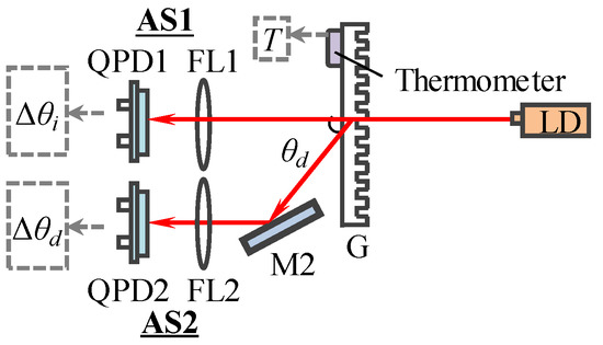 where, α is thermal expansion coefficient of the grating. T is the temperature of the grating during the experiment, which can be detected by a thermometer. Δθi and Δθd represent the variations of the incident angle and diffraction angle, which can be detected by two autocollimator sets (AS1, AS2), respectively, as shown in Figure 3. Both autocollimator sets are composed of a focus lens (FL1, FL2) and a quadrant-photodetector (QPD1, QPD2). By using Equation (4), the laser diode wavelength can be real-time corrected.