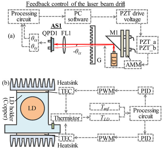 The stability of the laser diode wavelength is another factor that effects the accuracy and repeatability of the LDI. Figure 4 shows two comprehensive wavelength stabilization methods. As show in Figure 4a, method I is based on the principle of the laser beam drift compensation, which has been introduced in our previous researches [32]. The output of AS1 is adopted to feedback control the angle of an angle mirror mount (AMM), in which two mini-PZTs (PZT_a, PZT_b) are embedded into the threaded shafts of the AMM. By rotating the AMM, the focused spot of the laser beam can remain at the center of QPD1. Method II is based on the principle of automatic temperature control (ATC), as shown in Figure 4b. A closed-loop control system is adopted to improve the precision of temperature control. A negative temperature coefficient (NTC) thermistor is installed in a copper holder of the laser diode to detect the laser diode’s surface temperature (TLD). After comparing with the reference temperature (Tref), a differential signal is generated and input to the PID controller. Then, two thermoelectric cools (TECs), which are fed by an external current generator, are regulated to heat or cool according to the differential signal. By using this closed-loop temperature control system, TLD can be effectively controlled within the commanded accuracy. Combined with method I and method II, the laser diode wavelength can be real-time stabilized.