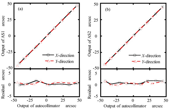 Prior to calculating the He-Ne laser wavelength, the AS1 and AS2 were calibrated by a commercial autocollimator (5000U3050, AutoMat, Tianjin, China), which has a measurement accuracy of 0.2 arcsec and repeatability of 0.05 arcsec. The calibration range was set to be ±50 arcsec. Figure 6 shows the calibration results of the AS1 and AS2 in the X- and Y-directions. It can be seen from the figure that the residual of each result was within ±0.4 arcsec.