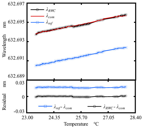 Then, the wavelength of the He-Ne laser was calculated by the RWC (λRWC) and compensator (λcom) under the various temperatures. Figure 7 shows the variation of the laser diode wavelength with temperature. The missing measured points correspond to the temperature period when the MCV500 was not in operation. For comparison, the wavelength (λref) evaluated by the equation, which was proposed in Ref. [7], was also plotted in the figure. As seen from Figure 7, the He-Ne laser wavelength was enlarged with the increase of the temperature. The laser wavelength (λRWC) obtained by the modified wavelength correction equation Equation (4) was larger than the wavelength (λref) obtained by Ref. [7]. λRWC was in a good agreement with that calculated by compensator λcom. It indicates that the measurement accuracy of the wavelength corrector proposed in this research is much higher than that proposed in Ref. [7]. The maximum residual between λRWC and λcom was evaluated to be ±0.007 nm, which is a satisfactory value for our designed long-stroke micro/nano positioning stage.