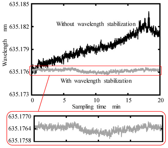 The feasibility of the real-time wavelength stabilizer (RWS) was investigated by using a laser diode (DI635-2-3, Huanic, Xi’an, China), which has a nominal wavelength of 635 nm and an output power of 2 mW. The experiment results are shown in Figure 8.