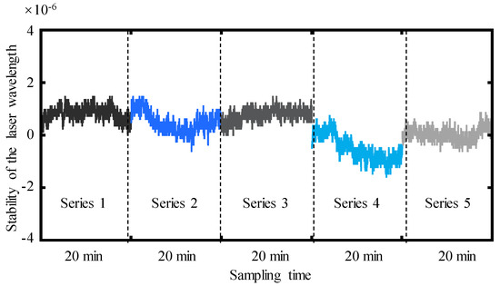 Wavelength measurement repeatability is a very important factor for the designed RWC and RWS in the MHI. The measurement repeatability was tested by a group of the wavelength measurement experiments, with which the same laser diode and same parameter of the sampling time and frequency. The sampling time for each experiment series was set to be 20 min. Figure 9 shows the tested results. The repeatability of the laser diode wavelength measurement was at the level of 1.3 × 10−6.