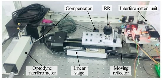As shown in Figure 11, an experimental setup was constructed to verify the feasibility and the measurement accuracy of the MHI. The commercial interferometer (MCV500), with a measurement accuracy of ±0.5 ppm and measurement range of 15 m, was employed as a reference for comparison. The interferometer unit of the MHI and laser head of the MCV500 were positioned on both sides of a precision motorized positioning stage (KA100, Zolix, Beijing, China), which has a moving range of 100 mm, a positioning accuracy of 30 μm, and a repeatability of ±3 μm. The moving reflector of the MHI and the retro-reflector (RR) of the MCV500 were mounted on the moving stage of the positioning stage, which was moved for a distance of 100 mm with a step size of 1 mm at a speed of 2 mm/s. The RWC and RWS were embedded in the MHI and activated during the displacement measurement.