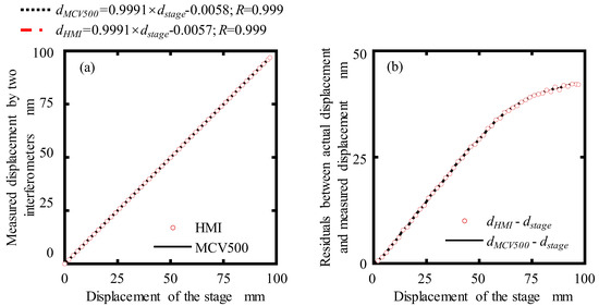 The measurement axis of the MHI and MCV500 were carefully aligned with the moving axis of the positioning stage so that the Abbe error and cosine error in displacement measurement can be eliminated. The displacement of the positioning stage was simultaneously measured by the MCV500 and the developed MHI. The experiment results for dynamic displacement measurement of a positioning stage are plotted in Figure 12. Figure 12a shows the relationship between the actual displacement (dstage) of positioning stage and the measured displacements by using the MCV500 (dMCV500) and proposed MHI (dMHI). As seen from the figure, the fitted slope and the linear correlation coefficients of two measured displacements are the same. The fluctuating trends of the residuals, which were obtained by making a difference between the actual displacement and measured displacement, are also almost the same, as shown in Figure 12b. This indicates the outputs of the proposed MHI are in a good agreement with those of the commercial laser interferometer.