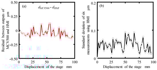 (a) Residual between the MCV500 and proposed MHI; (b) standard deviation of six displacement measurements by MHI.