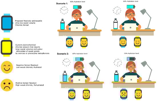 Dissolved in all biofluids are charged species, which lend them their mineral content and are involved in vital physiological processes ranging from the regulation of neuromuscular function to maintaining the acid–base balance in the body []. These electrically charged minerals are called electrolytes. A healthy composition of electrolytes in the body results in water homeostasis. One of the most common cases of electrolytic imbalances is observed as dehydration, an acute condition which, in the simplest sense, is the deficiency of water from the body. One of the electrolytic biomarkers in sweat that can be tracked to quantify hydration levels is chloride [,]. Being the most abundant anion in the extracellular fluid matrix makes sweat chloride ions more suitable than cations such as sodium and potassium for tracking hydration levels with high specificity without ionic crosstalk. On the other end of the spectrum, the tracking of chloride levels in sweat are implicated in the diagnosis and prognostic tracking of chronic diseases such as cystic fibrosis [,,].
