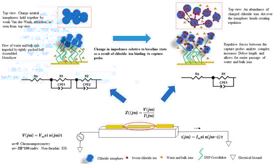The proposed sweat chloride sensor is in the form of a two-electrode electrochemical cell. It comprises of gold working and reference (or counter) microelectrodes deposited on a flexible, hydrophilic substrate where the counter electrode also serves as the well-poised reference electrode that is maintained at relatively constant potential. Open circuit potential (OCP) measurements of the electrode system revealed that the sensor response stabilizes at 1500 s after the electrode is introduced to the aqueous environment [see Supplementary Material]. This is associated with the inherent potential gradient and is indicative of time after which a dynamic equilibrium is reached. The magnitude of the measured OCP was found to be in the lower millivolt range (35.8 mV), which is typical of a stable electrochemical sensor []. The stacking of DSP on the gold electrodes and that of the chloride ionophore on the DSP crosslinker resulted in composite electrodes []. The interfacial behavior of these composite electrodes and the ambient sweat buffer, in response to various chloride dose concentrations, was probed using non-faradaic EIS and non-faradaic chronoamperometry. Electrochemical impedance spectroscopy is a powerful AC-based electroanalytical sensing method in which a small sinusoidal signal (generally voltage) is applied by a potentiostat in an electrochemical cell containing the electrolytical solution (spiked with the analyte), and the resultant current at the working electrode is measured [,]. Based on the magnitude and phase lag of the resultant current, the potentiostat then calculates and reports the impedance value in terms of its real and imaginary components. This process is repeated over a range of frequencies to capture the behavior of the interfacial region over a large spectral range: 1 Hz to 1 MHz in this work [,,]. Non-faradaic EIS is the impedance spectroscopic technique wherein there is a modulation in the attributes (capacitive changes) of the electrode–solution interface with no interfacial charge transfer. Non-faradaic EIS biosensors are often viewed as capacitive biosensors, and since no additional redox reagent is used in the sensing procedure, they have garnered considerable traction in POC and wearable development []. The results of EIS are as Bode magnitude and phase plots, where the magnitude and the phase of the interfacial impedance are plotted as a function of frequency. The interaction between the charged electrode and the sweat buffer creates an electrical double layer and the biomolecular crosslinker-capture probe stack creates the surficial capacitance. The chloride dosing response was analyzed using perspired human sweat samples (pH ~6) to calibrate the sensor for both EIS and CA. The variation in chloride dosing was achieved by the addition of potassium chloride into the sweat sample. Initial studies were based on synthetic sweat (SS pH 6, without KCl and NaCl) wherein the Nyquist and Bode plots for the blank solution (or zero dose) and that of the spiked solutions were compared [see the Supplementary Material]. The Nyquist plot for the SS zero dose consists of a small semicircle and a long diffusional tail, which are indicative of a small charge transfer resistance in the mid–high frequency range and the easy diffusion of sweat ions and metabolites (lactate, ammonia etc.) through the gaps between the head groups of the ionophores in the low-frequency range. It is speculated that if a nanoscale snapshot of the sensor stack were to be captured from the top, it would appear as a blanket of bulky ionophoric spheres balanced onto the gold electrodes via the DSP crosslinker. This blanket-like structure would be largely packed, leaving tiny pores/holes, because the bulky ionophore headgroups would rearrange themselves in such a way that affords them minimum steric hinderance and maximum Van der Waal’s attraction forces. When spiked sweat is transported onto the sensor, an abundance of chloride ions is introduced in the electrode–electrolyte system. These ions preferentially adsorb to the relatively large ionophore surfaces. An abundance of charged chloride ions dotting the ionophores produce significant repulsive forces to push them away, thereby dilating the pores on the “ionophore blanket” (Figure 2). This considerably reduces the transfer of bulk ions and water molecules, resulting in the decrease in the charge transfer resistance Rct, as evidenced by the reduction in the semicircle of the Nyquist plot with chloride dosing [see Supplementary Material]. On comparing the fitted equivalent electrical circuit (χ2 ~0.001) representative of the electrode–electrolyte interface after the ionophore incubation step and that of the first chloride dose (KCl in ultra-pure DI water), a switch in the circuit from two parallel RC circuits to a single parallel RC circuit was observed (Figure 2), indicating that the effects of the DSP–ionophore binding and the electrode bulk ion capacitance were overridden by the stronger influence of the chloride ions binding to the capture probe [see Supplementary information]. This effect is also observable in the shift observed from zero dose to the 10-mM dose in the Bode phase plot in Figure 4b.