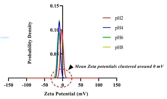 Probability density functions of zeta potential values for the entire physiologically relevant pH range (pH 2, 4, 6 and 8) measured in a human sweat analogue by the diffusion barrier method. Neutral or near-neutral behavior is evident from the clustering of the pdfs being 0 mV.