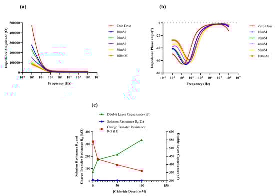 (a) Bode magnitude and (b) Bode phase plots obtained from non-faradaic electrochemical impedance spectroscopy (EIS) measurements for 1 Hz to 1 MHz range. Equivalent circuit parameters for the circuit corresponding to chloride dosing (Figure 2) were extracted for χ2 ~0.001 are shown in (c).