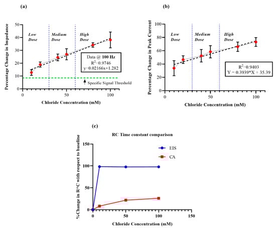 (a) Calibration dose response for non-faradaic EIS (100 HZ) for low, medium, and high chloride doses (n = 5), (b) Calibration dose response for non-faradaic chronoamperometry (CA) for low, medium, and high chloride doses (n = 4), (c) Comparison between the time constant (product of Rct and Cdl) of the EIS data and the average discharging time constant of the chronoamperograms.