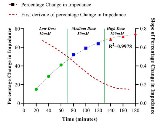 The continuous monitoring efficacy of the proposed sensing scheme was evaluated by continuously dosing low (10 mM), medium (50 mM), and high (100 mM) levels of chloride for a 180-min duration (n = 3), as shown in Figure 6. A dose-dependent variation in the slope was observed over the ranges of low, medium and high doses (Figure 6). Upon polynomial curve fitting, an R2 value of 0.9978 was achieved. In this study, the sensor has been dosed with increasing chloride levels after every 20 min for a span of 3 h. The sensor operated in an accumulative mode, and the sensor’s response to repeated increasing doses has been tracked. The slope of the response has been chosen to discriminate between the low, medium, and high chloride levels. As can be seen from Figure 6, the slope of the curve linearly decreases with increasing chloride doses. The plot reveals that even after 180 min, the sensor response does not completely flatten out, meaning that sensor does not saturate even after 3 h, and that there are still a lot of unbound capture probe sites available, owing to big size difference between the ionophore and analyte.