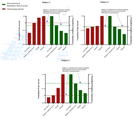 To test for the measurement efficacy for on-body testing, non-faradaic EIS (100 Hz) and non-faradaic CA measurements were run on three healthy human subjects for three technical replicates each. A blank dose of human sweat analogue, devoid of chloride ions, was taken as negative control, and the highest dose of the sensor dynamic range was chosen as the system validating positive control. As shown in Figure 7, the data obtained from all three subjects confirm that the subjects did not have abnormal chloride levels, as the chloride levels for all of the three subjects fall between the zero (0 mM) and medium dose (50 mM).
