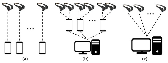Third, all devices are connected directly to one high-end server simultaneously, as depicted in Figure 1c, which is referred to as the ‘n:1’ connection for n devices.