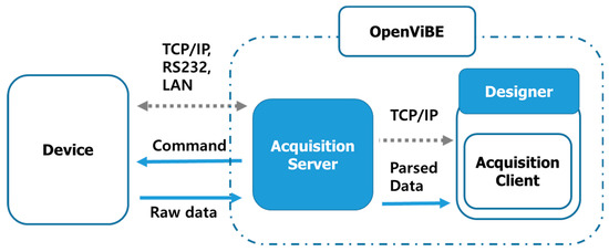 Hyperscanning experiments require not only simultaneous data acquisition from multiple devices, but also various functions for experimental progress. Fortunately, there are well-organized open sources for real-time experiments, such as BCI2000 [49], OpenViBE [47], and BCILAB [50]. We adopted OpenViBE in our proposed acquisition framework because it has synchronization and multi-acquisition modules for multimodality. OpenViBE is open-source software for real-time neuroscientific experiments developed in INRIA. It provides many functions, such as scripting, real-time signal monitoring, acquisition, filtering, stimulus presentation, and file input/output. The basic structure and acquisition flow between OpenViBE and the device are illustrated in Figure 2. The acquisition server controls the device, receives data from it, and parses them. The designer communicates with the acquisition server and performs functions to process the data, such as real-time monitoring, filtering, and file input/output. Our custom-made code used to control the device, synchronize all devices, and finally acquire EEG data, was added to the OpenViBE acquisition server.