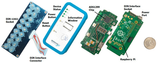 Firstly, a small piece of EEG acquisition hardware was developed and manufactured for our multi-user (large scale) hyperscanning (BioBrain Inc., Daejeon 35203, Korea). An ADS1299 chip from Texas Instruments (Dallas, TX, USA) was used for the EEG acquisition module, and 2.4 GHz Wi-Fi was introduced to communicate via the TCP/IP software protocol. The Raspberry Pi Zero W model was adopted as the wireless communication hardware. This EEG device, which weighs approximately 56 g (without battery) and is 93 × 47 × 16 mm in size, is battery-powered, operates at a speed of 1 kHz, and consists of seven monopolar and one bipolar channels. We note that a 10,000 mA Xiaomi battery was used (approximately 194 g) in our validation experiment, as our device must operate continuously for up to two hours. EEG data are transmitted via a commercialized wireless router (AD7200-Nighthawk® X10 model from NETGEAR). Each device is connected to the router and assigned to one internet protocol (IP) address. In addition, our manufactured device uses a Deutsches Institut für Normung (DIN, German Institute for Standardization) 42802 type snap-lead and a passive disposable foam electrode. The header consists of a synchronization element (2 bytes), device information (1 byte), and 3 bytes of the packet number as a timestamp. The payloads are a total of 24 bytes with 8 channels of 3 bytes (24-bit resolution per channel). Therefore, one device’s transmission rate is 30 kB per second. Our hardware for wiring and the electrodes is shown in Figure 3.