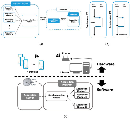 (a) Connection diagram of acquisition program and OpenViBE. Our custom-made software acquires data from the devices and sends parsed and synchronized data to the OpenViBE acquisition server by message passing; (b) Comparison between synchronous and asynchronous communications. In synchronous communication, the main thread should wait until data from the device are read; however, asynchronous communication delivers the transmission request only and continues to process the main thread; (c) Diagram of framework configuration overall.