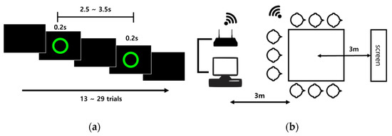 The green circular stimulus for the visual ERP is presented on a blank black background on a screen, as shown in Figure 5a. All participants sat 3 m on average from the screen, and were instructed to count the number of visual stimuli presented. All stimulus onset times were marked for the visual ERP. An inter-stimulus interval (ISI) between 2.5 s and 3.5 s was selected randomly and the stimulus duration was 0.2 s. A range of 13–29 trials were conducted for each run, and 10 runs were conducted for a total of 188 trials collected for each participant.