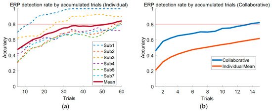 ERP detection rates as the number of trials increased. (a) Individuals’ ERP detection rates. The red bold curve represents the mean detection rate over all participants; (b) The ERP detection rate for the group of six participants (all of three participants’ ERP trials were rejected, so six participants’ trials were used ultimately).