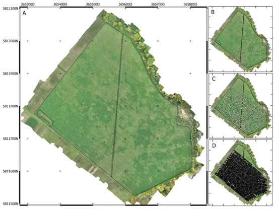 The Königsfeld has a total area of 15 ha and was covered by a mixture of grass and alfalfa. The field was used as grassland since 2011, predominantly as grazing land for cattle. In the past, a fence parted the field into two halfs. Despite removal, the growing patterns of the grassland are still affected at its former location. The same applies to a former watering trough for the cattle that was situated at the western corner of the field. For that reason, both areas were disregarded in the following analyses (Figure 1A).