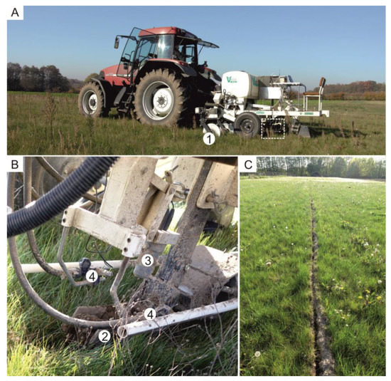 (A) Veris mobile sensor platform, (B) Veris pH-Manager, and (C) furrow cut by the pH sampler trough. Numbers indicate (1) rolling ECa coulter electrodes, (2) pH sampler trough, (3) pH electrodes, and (4) cleaning nozzles.