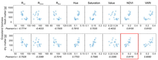 Scatterplots and correlations between fresh and dry matter weight of the grassland biomass and multi-spectral indices deduced from the UAV-based aerial photographs.