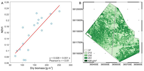 (A) Linear regression model of grassland biomass (dry) and normalized difference vegetation index (NDVI) and (B) grassland biomass estimation for the entire field.