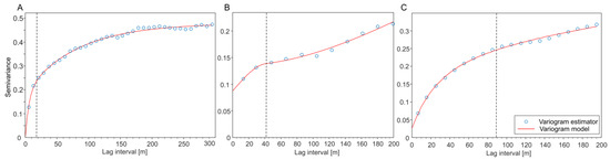Empirical semivariograms and fitted models of (A) NDVI derived grassland biomass [dry matter weight, g m−2], (B) pH value, and (C) ECa[mS m−1]. Dashed vertical lines indicate the range of the first component of the nested theoretical models.