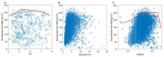 To investigate the relationship between sensor-based pH value, ECa data, and grassland biomass, in a first step scatterplots were created (Figure 7). At first sight, the scatterplots show no correlation between the dependent and the independent variable and, especially visible for the ECa data, a non-constant variance (Figure 7B). In contrast, the variance of ECa clearly increases with increasing grassland biomass which violates one of the key assumptions of linear regression. This is generally due to the complex nature of factors effecting biomass production. In the context of Liebig’s law of the minimum, the variability in the biomass data cannot be entirely explained by ECa and the pH value alone since many other unmeasured factors are a potentially limiting resource for plant growth [46]. Thus, instead of linear regression analyzing the correlation of the means, quantile regression was applied estimating the 95th percentile of the conditional distribution of grassland biomass. This masks the effect of other unknown or unmeasured yield-limiting factors (e.g., [36,38,39]) and the limiting effect of ECa and the pH value can be visualized by means of the boundary line.