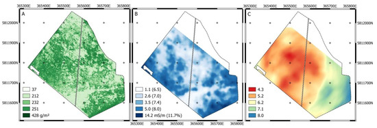 The Königsfeld was mapped in March 2017 for pH and apparent electrical conductivity (ECa) using the Mobile Sensor Platform (MSP) by Veris technologies (Salinas, KS, USA) as described by Lund et al. [26] and Schirrmann et al. [27] (Figure 2A).