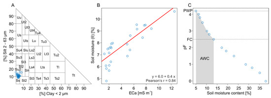 (A) Soil texture classes of the 25 lab-analysed reference soil samples. (B) Linear regression analysis of apparent electrical conductivity (deep) and soil moisture. (C) Mean water retention curve of Königsfeld based on soil texture of the samples and the soil physical data base of [37]. (PWP: Permanent wilting point, FC: Field capacity, AWC: Available water content).