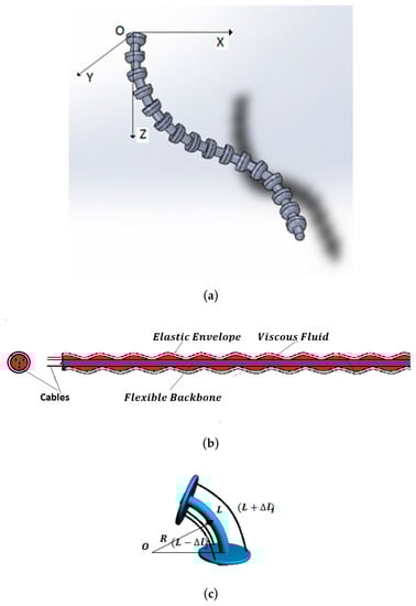 The architecture of this sensor consists of a main viscoelastic component determined by a long flexible backbone wrapped in a cylindrical elastic envelope. Three antagonist cables are implemented at the periphery of the system. In static behavior, curvature is obtained by the differential measurement of the cable lengths, Figure 1c [30]: