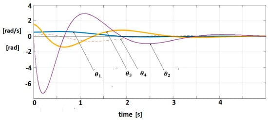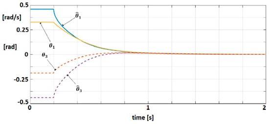 An observer (Equations (49)–(51)) with is associated to the linearized dynamic model. The matrix verifies the condition as to be Hurwitz matrix. For , solution of is obtained with . A control law (55) with were selected. Equations (57)–(61) are easily verified. Figure 10 shows the trajectories of physical significance variables, position and velocity, for the system and observer.
