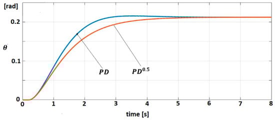 The behavior of the linearized model (Equation (68)) for both control laws (Equations (73) and (74)) is studied. The trajectories of angular position for target signal are shown in Figure 8.